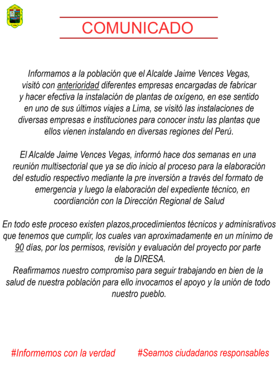 Por su parte, la municipalidad de Las Lomas emitió un comunicado señalando que si realizan un trámite que evalúa comprar una planta de oxígeno, sin embargo; señalaron que en un plazo de 90 días se tendría los informes correspondientes.