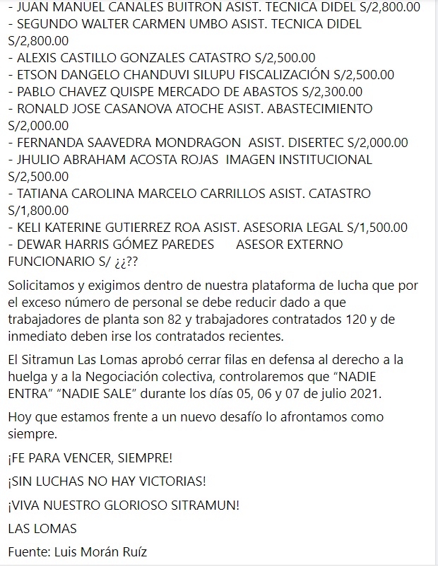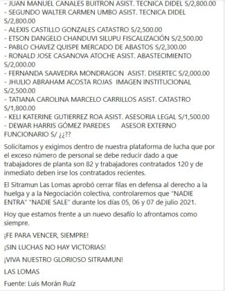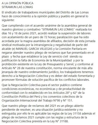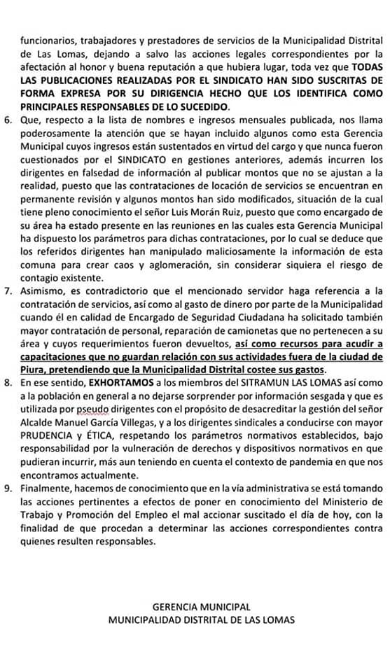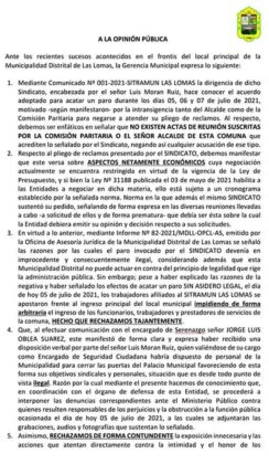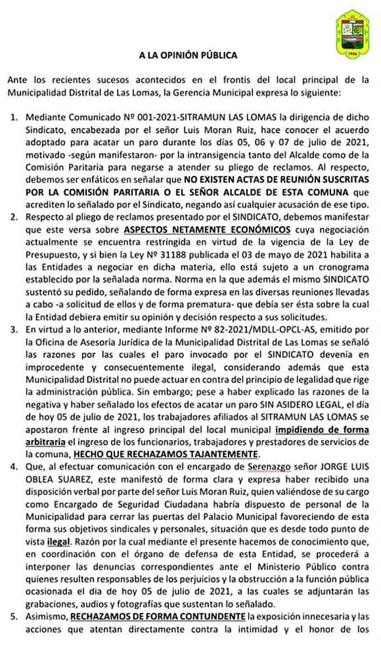Es preciso destacar que la gerencia municipal de Las Lomas emitió, el lunes 5 de julio, un comunicado señalando que el paro que vienen acatando los trabajadores sería ilegal e iniciarán las acciones correspondientes.