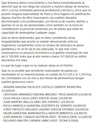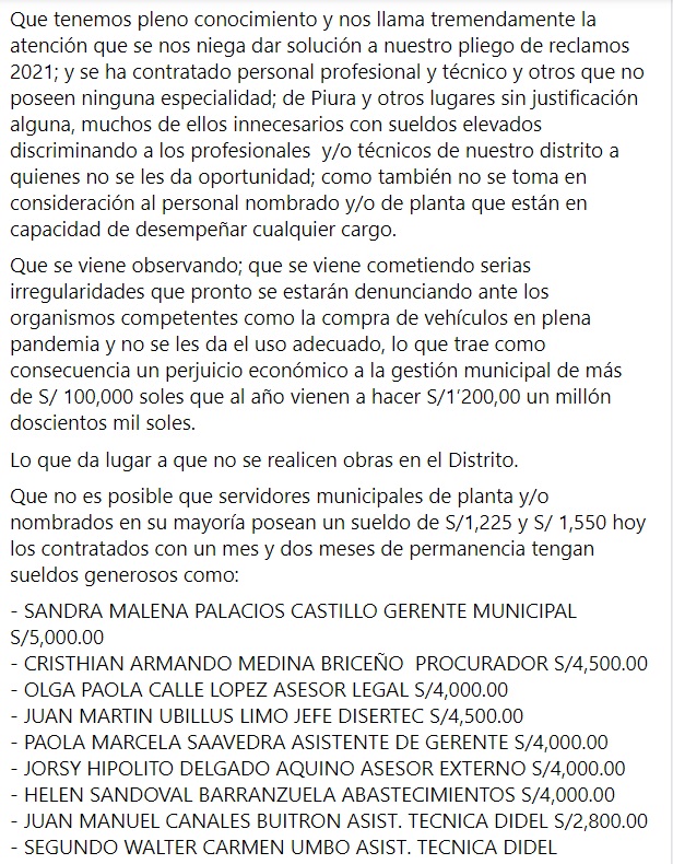 Los trabajadores sostienen que presuntamente “se ha contratado personal profesional y técnico y otros que no poseen ninguna especialidad; de Piura y otros lugares sin justificación alguna, muchos de ellos innecesarios y con sueldos elevados discriminando a los profesionales y/o técnicos de nuestro distrito a quienes no se les da oportunidad; como también no se toma en consideración al personal nombrado y/o de planta que están en capacidad de desempeñar cualquier cargo”, se lee en su comunicado.
