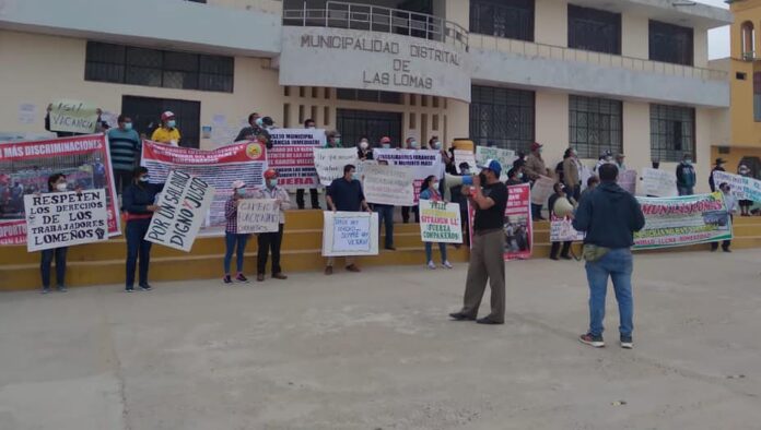 El Sindicato de trabajadores municipales del Distrito de Las Lomas viene acatando un paro desde el pasado 5 de julio, en los exteriores de la municipalidad, en reclamo por presuntas irregularidades y direccionamientos de la gerencia municipal para la contratación de personal que no corresponde a las necesidades inmediatas.