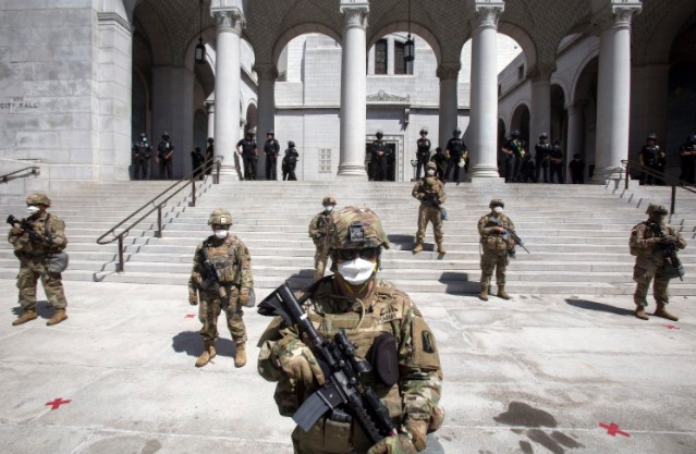 Por la tarde, el Ayuntamiento de Los Ángeles estaba protegido por tanquetas militares de la Guardia Nacional, en una imagen que quedará para los libros. Una pequeña protesta de unas 200 personas se fue concentrando frente a la escalinata. Ante los insultos, el capitán Billy Brockway, al mando del operativo, trató de hablar con una manifestante. Ella se negó. Los agentes aguantaron insultos durante varias horas. Monica Sinclair, de 29 años, aseguraba junto a la valla policial que se quedarían allí “toda la noche”. “La policía está poniendo nerviosa a la gente con todo este despliegue militar”, decía sobre los enfrentamientos.