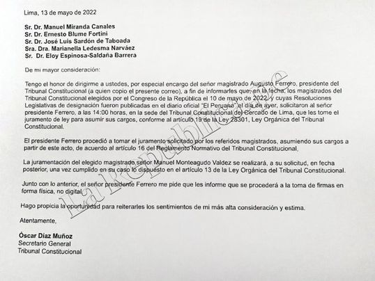 La referida comunicación del secretario general Oscar Díaz tuvo lugar momentos después que se dio a conocer que el titular del TC juró a cinco de los seis jueces tribunos elegidos por el Congreso.
