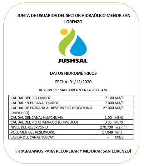 La Junta de Usuarios de San Lorenzo reportó que hasta las 6 p.m del 1 de diciembre, cuentan con un caudal de entrada al reservorio de 27.00 m3/s
