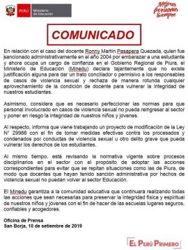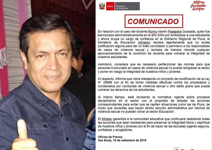 El Ministerio de Educación emitió un pronunciamiento en el que rechaza la contratación del docente Ronny Pasapera Quezada quien en el 2004 fue separado del sector educación por embarazar a una escolar.