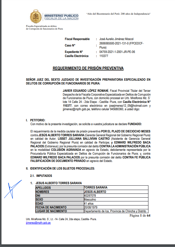Cutivalú tuvo acceso a la solicitud del titular de la Fiscalía Especializada en Delitos de Corrupción de Funcionarios, Javier Eduardo López Romaní, que será evaluada este viernes por la jueza Judith Cueva Calle del Sexto Juzgado de Investigación Preparatoria especializado en Delitos de Corrupción de Funcionarios de Piura.