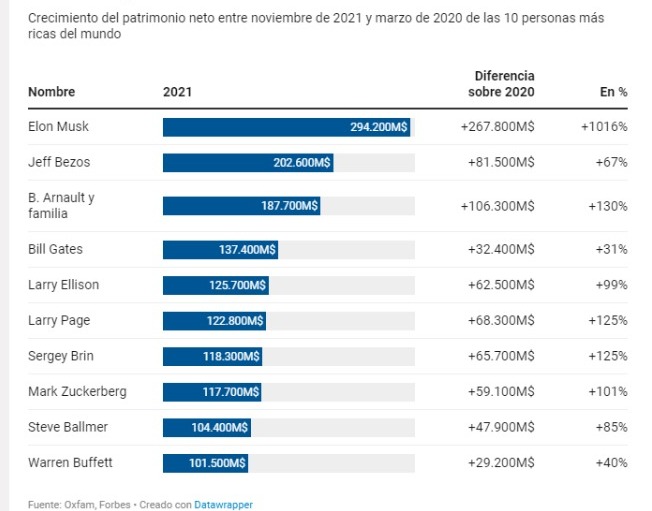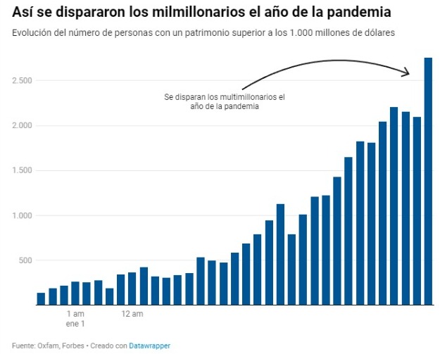 Desde el inicio de la pandemia, a nivel mundial los milmillonarios han aumentado su fortuna en cinco billones de dólares, más que en los últimos 14 años acumulados. Se trata del mayor incremento de la riqueza de los milmillonarios desde que se tienen registros, según el estudio de la ONG.