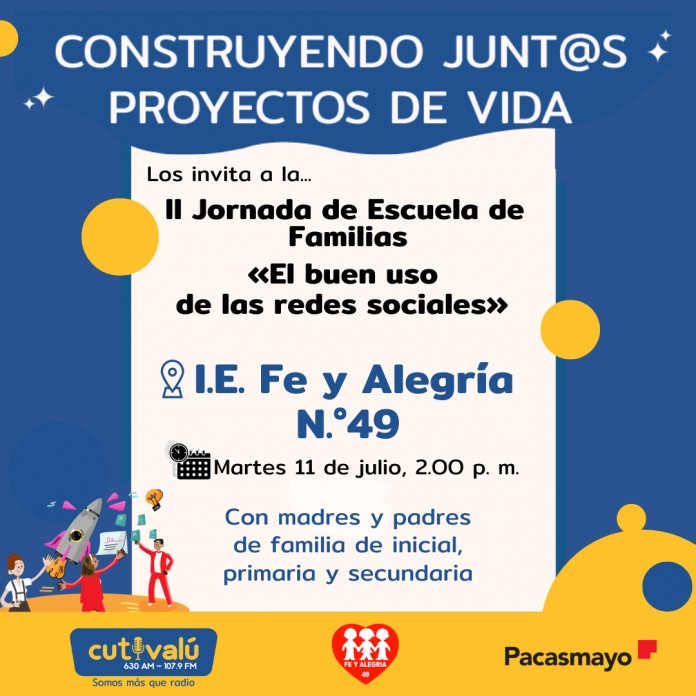 Este martes 11 de julio a las 2.00 p. m. se realizará la II JORNADA DE ESCUELA DE FAMILIAS dirigido a madres, padres y apoderados de las y los estudiantes de inicial, primaria y secundaria de la I. E. Fe y Alegría N.°49 denominada «El buen uso de las redes sociales».