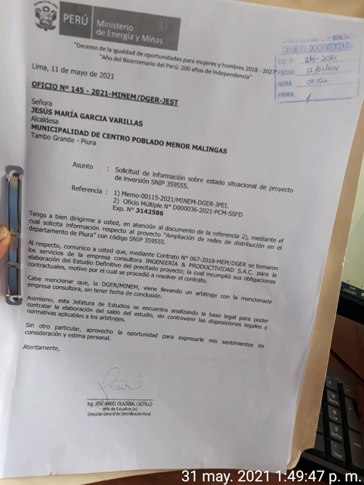En el documento enviado a la municipalidad de Malingas, el MINEM señaló que hay un proceso de arbitraje de por medio y que la jefatura de estudios está analizando la base legal para contratar la elaboración del saldo de este estudio, que beneficiará a 28 067 personas de 357 localidades de Huancabamba, Morropón, Piura, Sechura, Sullana y Talara, según precisó la alcaldesa.