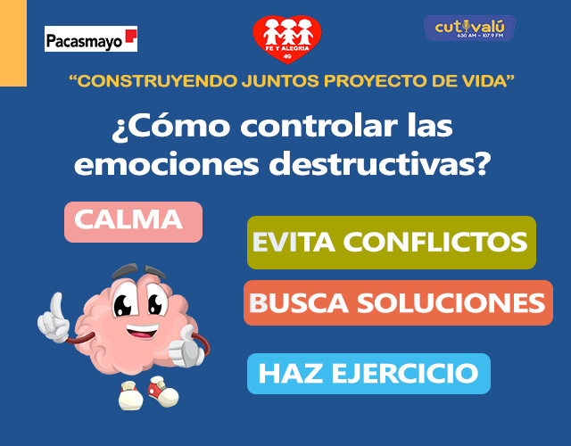 La especialista, Amelia Chunga reyes, licenciada en psicología, manifestó que en la adolescencia hay cuatro emociones básicas: Ira, miedo, alegría y tristeza, es por ello que gracias al programa de Cutivalú y Cementos Pacasmayo: “Construyendo juntos proyectos de vida” adolescentes de Fe y Alegría N49’ del distrito Veintiséis de Octubre, participaron del taller virtual:“Aprendo a controlar mis emociones”.