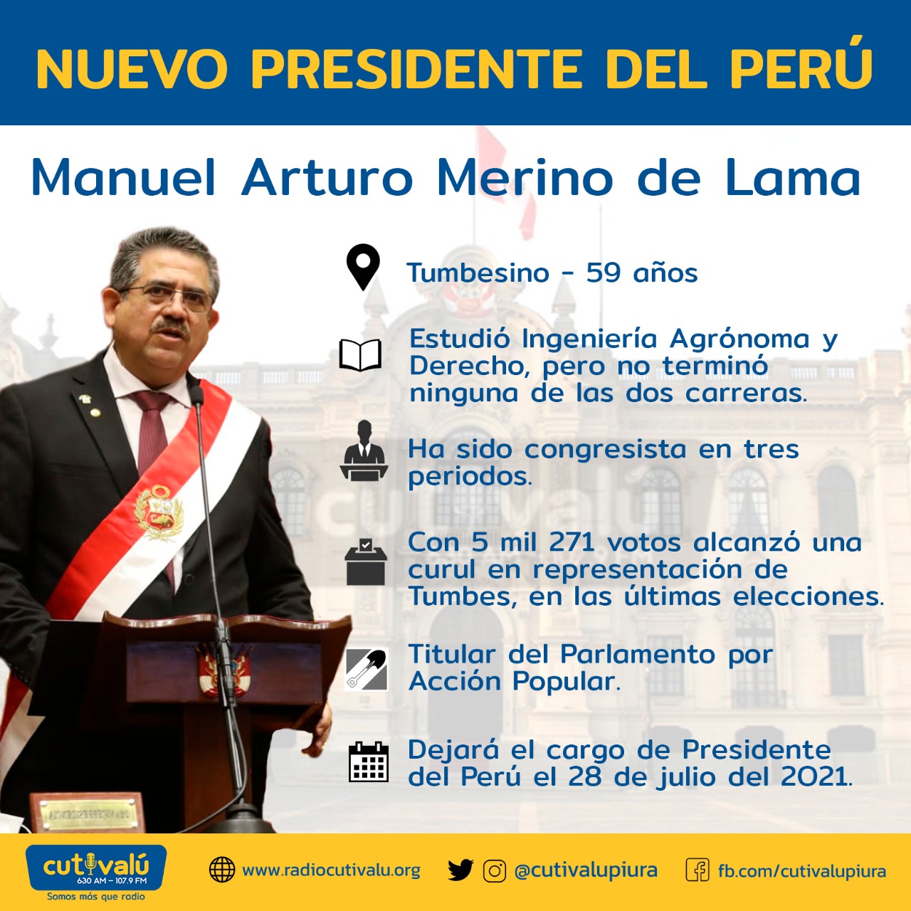 Manuel Merino, juró este martes 10 de noviembre como jefe de Estado. Este acto tendrá lugar después de que el lunes se aprobada la vacancia contra Martín Vizcarra Cornejo.