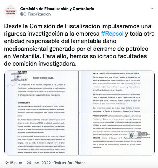 “Impulsaremos una rigurosa investigación a la empresa Repsol y toda otra entidad responsable del lamentable daño medioambiental generado por el derrame de petróleo en Ventanilla. Para ello, hemos solicitado facultades de comisión investigadora”, comunicó la Comisión de Fiscalización el último lunes.