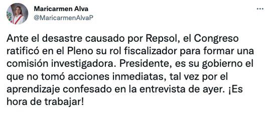“Ante el desastres causado por Repsol, el Congreso ratificó en el pleno su rol fiscalizador para formar una comisión investigadora. Presidente, es su gobierno el que no tomó acciones inmediatas, tal vez por el aprendizaje confesado en la entrevista de ayer. ¡Es hora de trabajar!”, escribió Alva en su cuenta de Twitter.