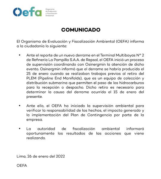 Por su parte, OEFA también ha confirmado en su respectivo comunicado que este nuevo derrame se habría producido, según Osinergmin, “cuando se realizaban trabajos previos al retiro del PLEM (Pipeline End Manifolds), que es un equipo de colección y distribución submarina que permite el paso de los hidrocarburos para la recepción o despacho”, explica la entidad.