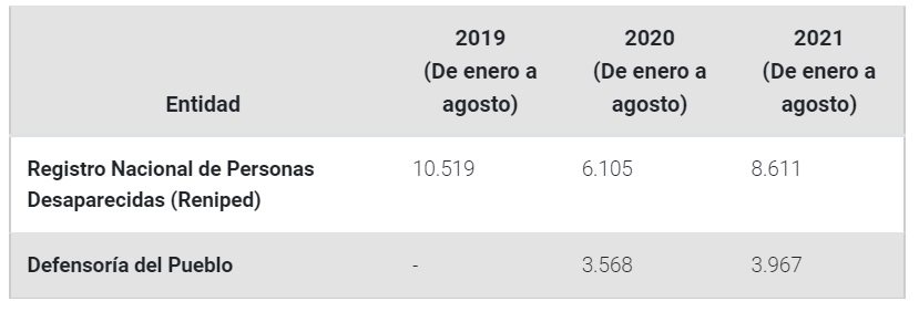 Cabe resaltar que, la contabilidad hecha por esta institución se empezó a realizar a inicios del 2020, por lo que no se manejan cifras antes de que se impongan las medidas restrictivas por la COVID-19. Frente a esta situación, Isabel Ortiz, comisionada de la adjuntía para los Derechos de la Mujer, agregó que la Defensoría del Pueblo comenzó a sistematizar las alertas publicadas por la Policía en el año 2020, a raíz de que, en el 2019, de las 166 víctimas de feminicidio, 16 tenían un antecedente de desaparición.