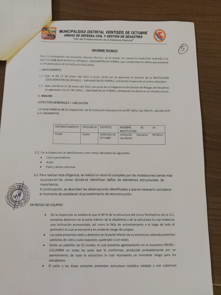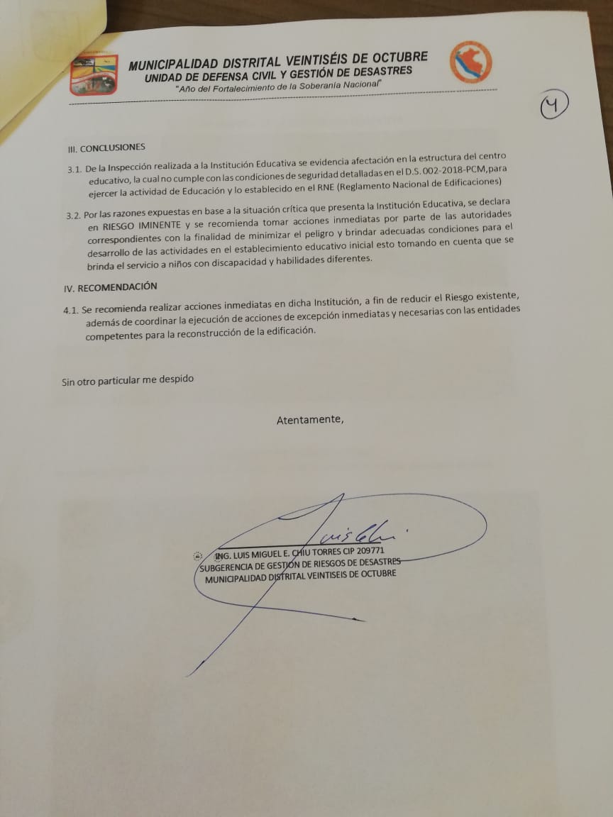 La subdirectora Lourdes Sandoval Zapata indicó que la institución ha sido declarada en alto riesgo por el área de Defensa Civil de la Municipalidad Distrital de Veintiséis de Octubre.