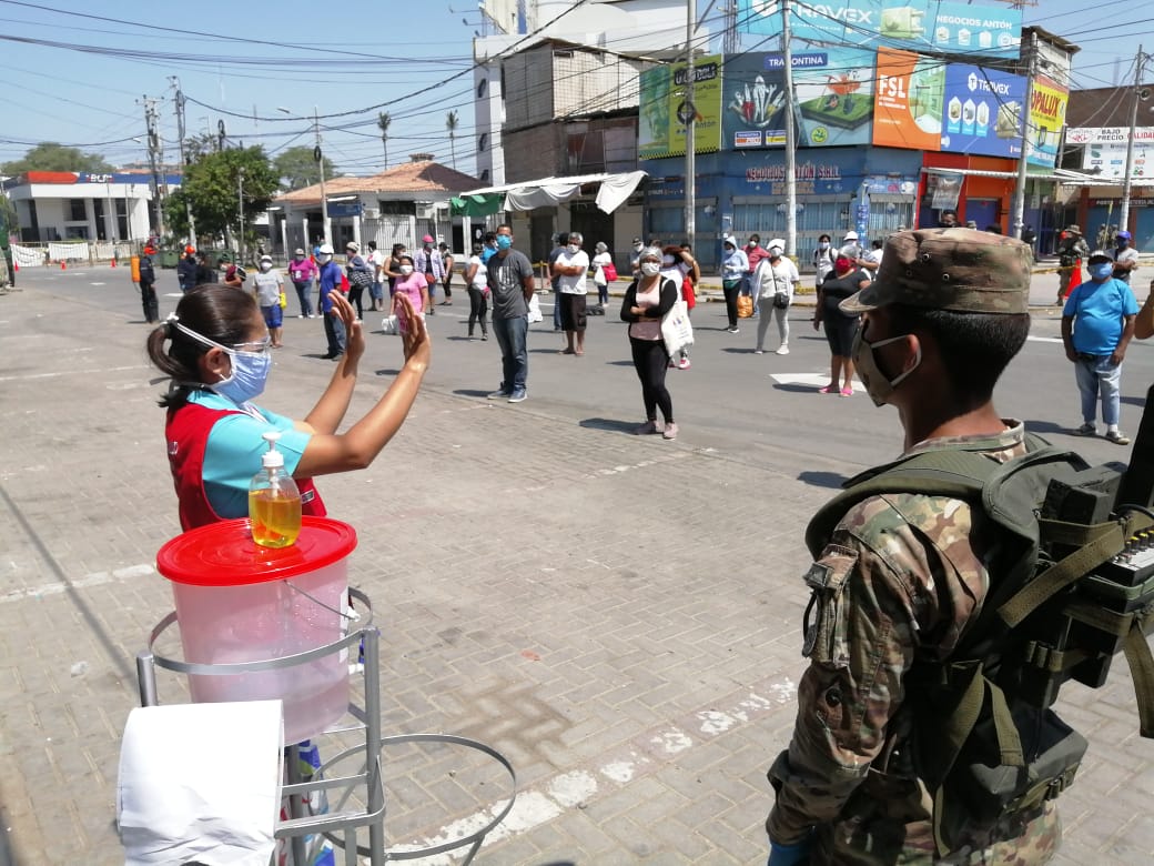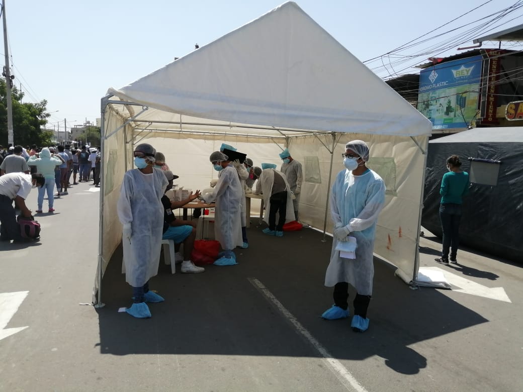 Se precisó que existe un flujo en donde el Ejército Peruano ordena a los comerciantes respetando el distanciamiento físico, luego uno por uno pasan para el test de prueba rápida en las carpas instaladas por la Dirección Regional de Salud (Diresa).