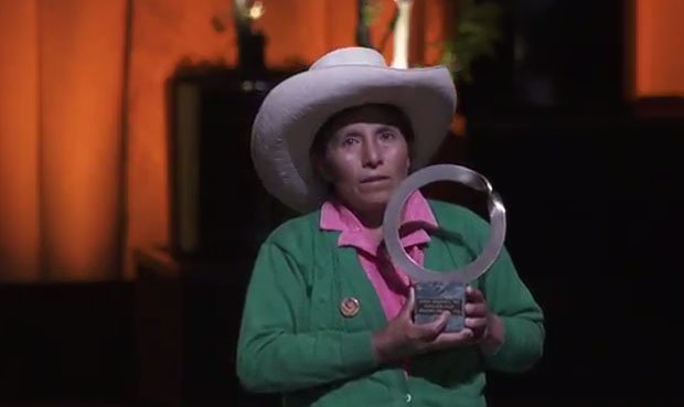 Con el puño en alto, Máxima Acuña exclamó: «No tengo miedo al poder de las empresas». Esta noche la campesina peruana recibió el prestigioso Premio Ambiental Goldman por su incansable lucha contra la minera Yanacocha.