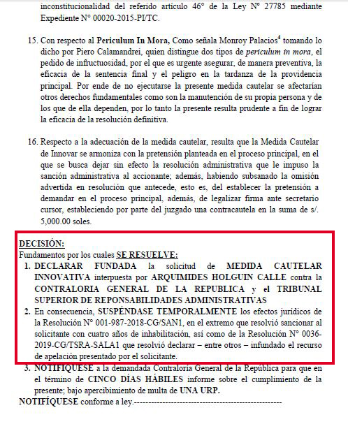 Cutivalú se comunicó con el gerente municipal Arquímedes Holguín Calle, quien informó que a fines de setiembre regresó al cargo gracias a una medida cautelar que presentó el 6 de setiembre ante la Corte de Piura. La medida fue declarada fundada el 7 de octubre, por la jueza Luz María Ramos Morán del Tercer Juzgado Laboral de descarga transitorio de Piura, ordenando la suspensión temporal de la sanción de la Contraloría.