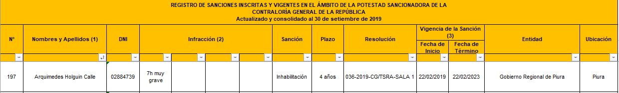 A través de la resolución N° 001 – 687 – 2018 – CG/SAN1 con fecha 5 de noviembre de 2018, la Contraloría de la República inhabilitó por cuatro años a Arquímedes Holguín Calle para ejercer cualquier cargo público.