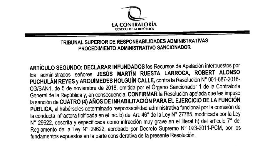 No obstante, el Tribunal Superior de Responsabilidades Administrativas de la Contraloría de la República, a través de la resolución N° 0036-2019-CG/TSRA-SALA1, de fecha 15 de febrero declara infundada la apelación y confirmó la inhabilitación. Tras ello, Holguín Calle renunció al cargo.