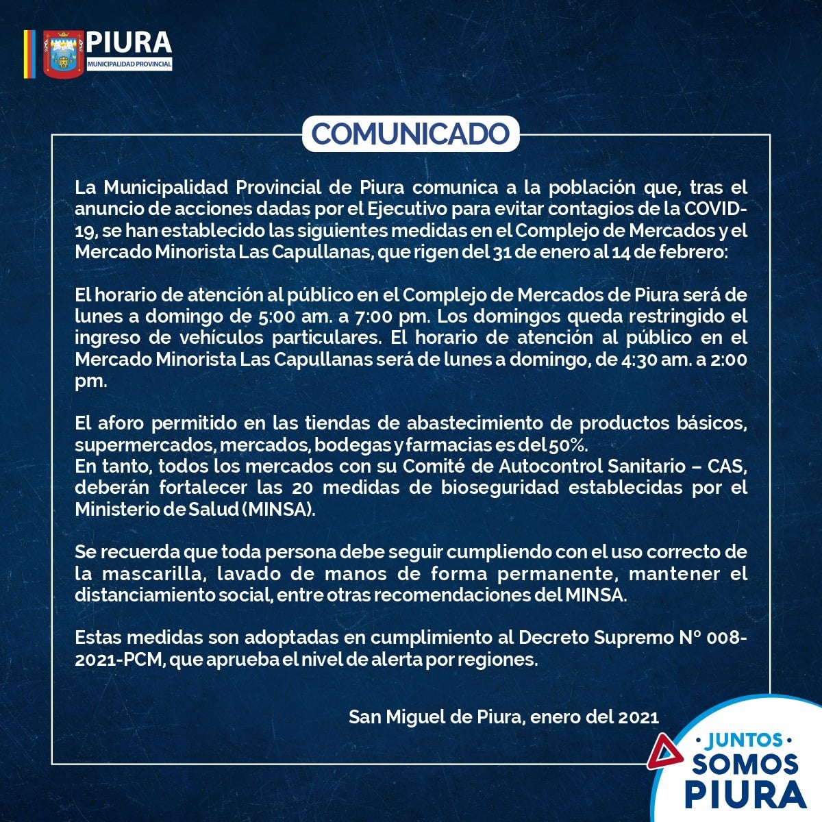 Debido a las nuevas medidas que brindó el Estado, la Municipalidad Provincial de Piura dispuso un nuevo horario de atención para el complejo de mercados. A partir del domingo 31 de enero atenderán de lunes a domingo, desde las 5:00 a.m. hasta las 7:00 p.m. Los días domingos se restringe el uso de vehículos particulares.