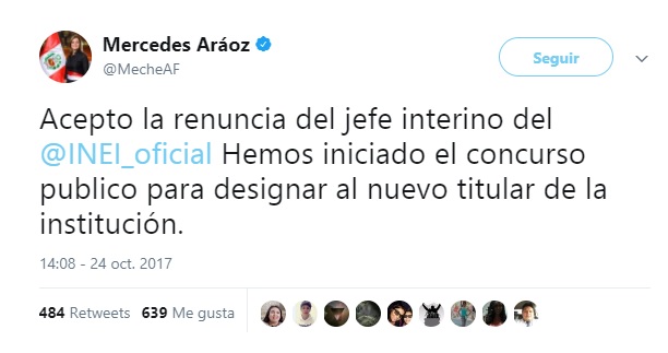 La presidenta del Consejo de Ministros, Mercedes Aráoz, anunció esta tarde que aceptó la renuncia presentada por Aníbal Sánchez de su cargo como jefe interino del Instituto Nacional de Estadística e Informática (INEI), esto a raíz de los cuestionamientos en su contra por los incidentes ocurridos durante el Censo Nacional 2017.