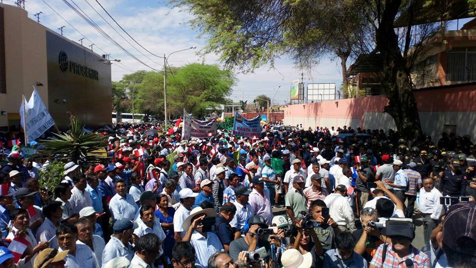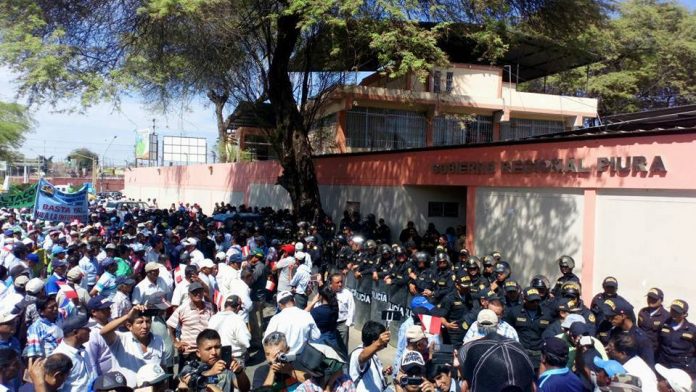 Los agricultores de diversos valles de la región que vienen marchando por las calles de Piura llegaron a la sede principal del Gobierno Regional para hacer sentir su voz de protesta por la demora en la reconstrucción.