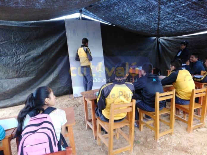 Más de 100 escolares de secundaria del caserío Imbo, en el distrito de Sondor (Huancabamba), construyeron carpas con sacos y maderas, para tener donde estudiar al haber desocupado el local que las rondas campesinas les prestaba desde hace nueve años.