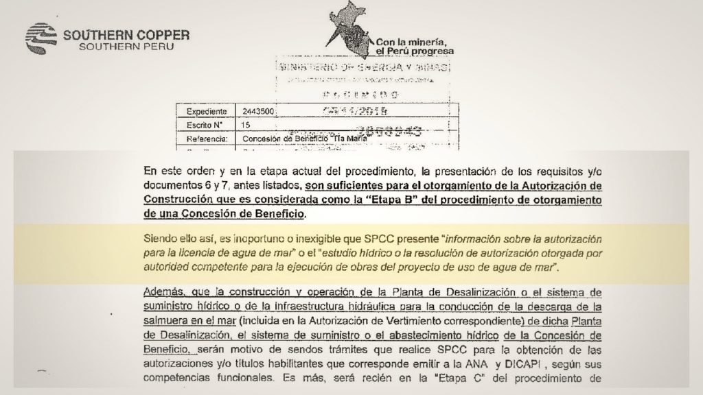 Pero en el documento que llegó al ministerio, la minera se negaba a contestar algunas de las 14 observaciones. En su respuesta a la DTM –Escrito Nº 2868943 del 6 de noviembre del 2018– la empresa dijo: “La presentación de los requisitos y/o documentos listados son suficientes para el otorgamiento de la autorización (…) es inoportuno o inexigible que [Southern Copper] presente información sobre la autorización para la licencia de agua de mar o el estudio hídrico o la resolución de autorización para la ejecución de obras del proyecto de uso de agua de mar”.