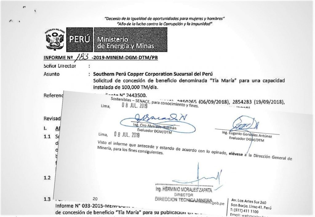 Entre tanto, el mismo lunes 8 de julio, en la Dirección Técnica de Minería (DTM) se redactaba la última parte del Informe 183-2019-Minem para responder el levantamiento de observaciones que entregó Southern Cooper en noviembre del 2018. El documento de 20 páginas fue firmado por los evaluadores de esta dirección, Ciro Alvarado Huamán y Eugenio Gonzáles Antúnez, quienes concluyeron que se debía otorgar la licencia a Southern Cooper.