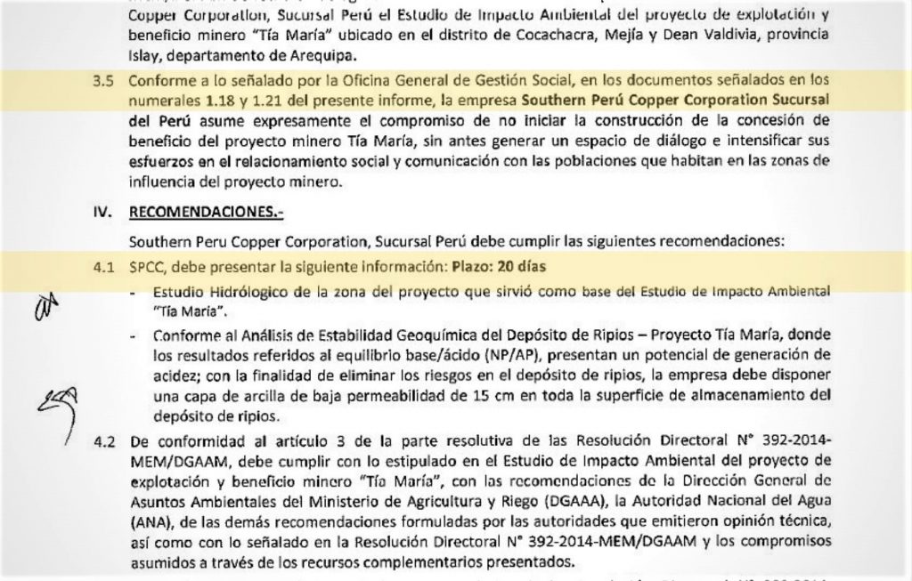 A pesar de ser favorable a Southern Cooper, el informe 183-2019-Minem incluyó dos recomendaciones que la compañía debe subsanar en los 20 días siguientes, los cuales vencerían el 6 de agosto próximo. Primero, “entregar el estudio hidrológico de la zona del proyecto que sirvió como base del Estudio de Impacto Ambiental de Tía María”; y, el segundo, incluir en su proyecto “una capa de arcilla de baja permeabilidad de 15 cm en toda la superficie de almacenamiento del depósito de ripios” a fin de eliminar riesgos.
