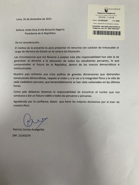 La ministra de Educación, Patricia Correa, presentó su renuncia al cargo ante la presidenta Dina Boluarte, a raíz de los decesos registrados en los enfrentamientos entre las fuerzas del orden y manifestantes durante las protestas en el interior del país.