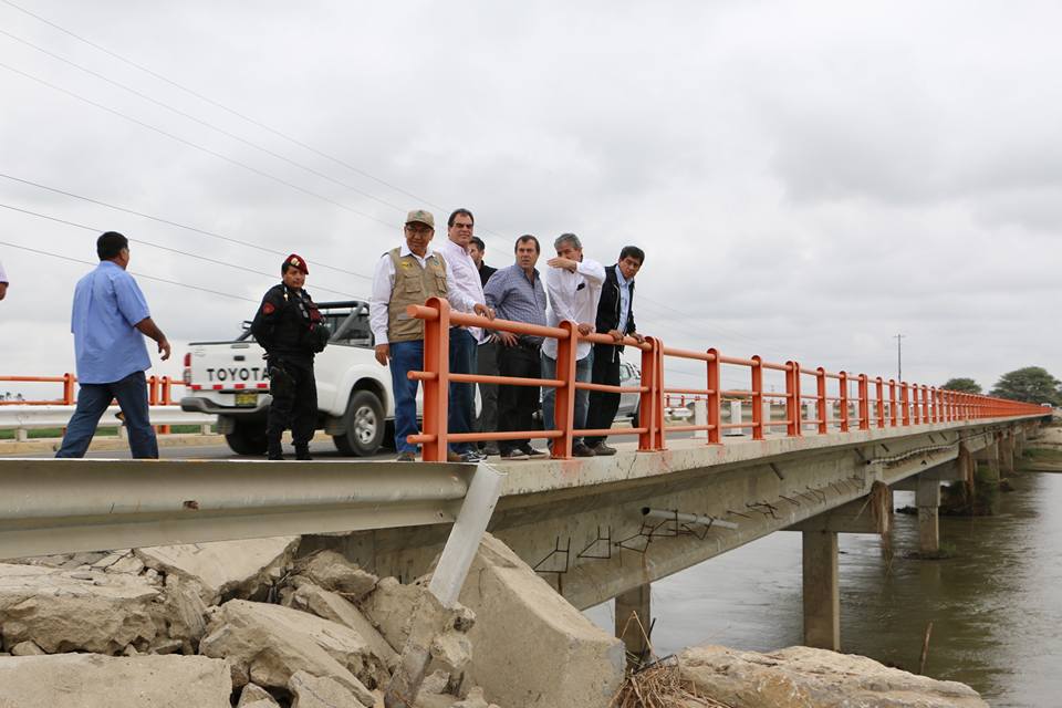 El ministro de transportes y comunicaciones, Bruno Giuffra Monteverde, acompañado del gobernador regional de Piura, Reynaldo Hilbck Guzmán, recorren ahora mismo el puente Independencia, en el Bajo Piura, para analizar una solución al dique fusible.