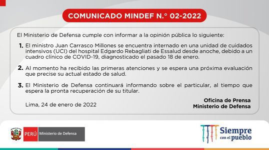 En ese sentido, la institución precisó también que espera la pronta recuperación del titular del sector. “El Ministerio de Defensa continuará informando sobre el particular, al tiempo que espera la pronta recuperación de su titular”, se lee en el comunicado.