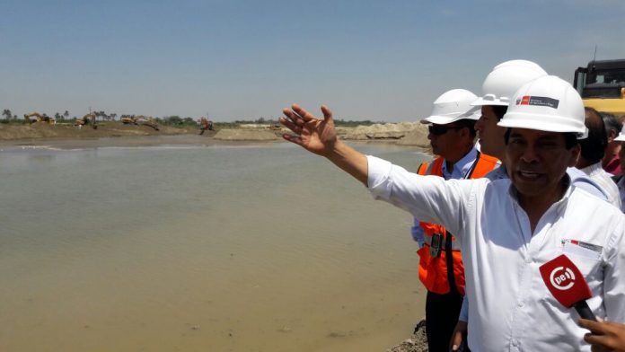 El ministro de Agricultura, José Manuel Hernández y el director de la Autoridad para la Reconstrucción, Edgar Quispe Remón recorren los trabajos de descolmatación del río Piura, a la altura del puente Independencia.