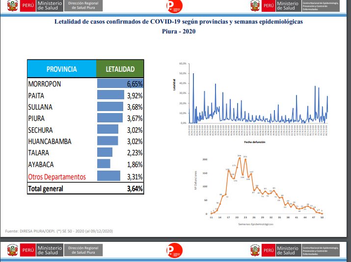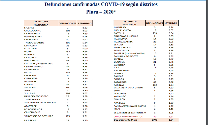 De acuerdo al reporte de la Dirección Regional de Salud, la cifra de letalidad (índice de muertes frente a los contagiados) en la región Piura es de 3.64%, es decir tres fallecidos por cada 100 infectados. La provincia de Morropón tiene el doble de letalidad que el promedio regional.