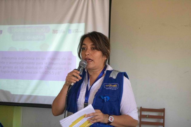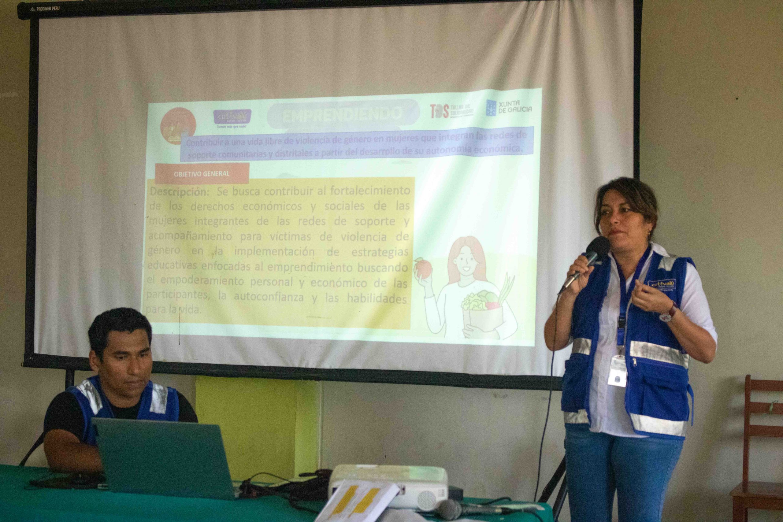 La coordinadora del proyecto, Veronica Luy, brindo información sobre los proyectos económicos que se desarrollarán en el distrito y cómo se espera que contribuyan a la igualdad y el desarrollo sostenible: [nace de un interés de Cutivalu por trabajar, prevenir y erradicar el estado de violencia… busca que las mujeres a través de diversos programas de habilidades blandas, duras y técnicas tengan herramientas para elaborar un plan de negocio de alguna idea de emprendimiento…]