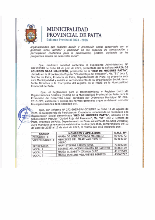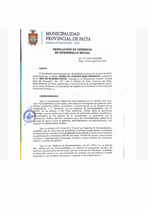 La Municipalidad Provincial de Paita, a través de la Gerencia de Desarrollo Social, emitió la Resolución N.° 177-2025-GDS/MPP, mediante la cual se reconoce oficialmente a la Red de Mujeres Paita como una organización social formalizada e inscrita en el RUOS.