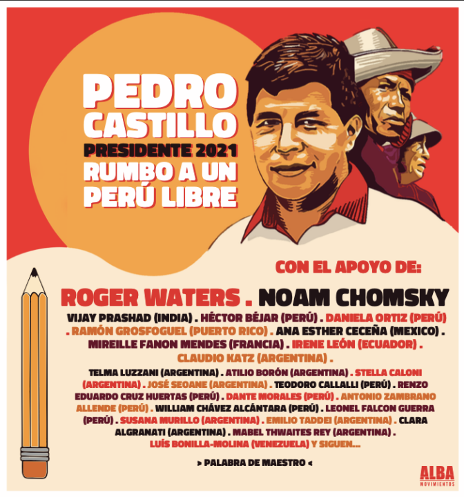 En esta segunda vuelta electoral en Perú, el candidato presidencial Pedro Castillo (Perú Libre) es «la única opción capaz de refundar una vieja y postergada esperanza» que convendría no solo a nuestro país sino a toda América, señalan el lingüista Noam Chomsky, el músico Roger Waters y un centenar de artistas, intelectuales y profesionales que han manifestado su apoyo al profesor.