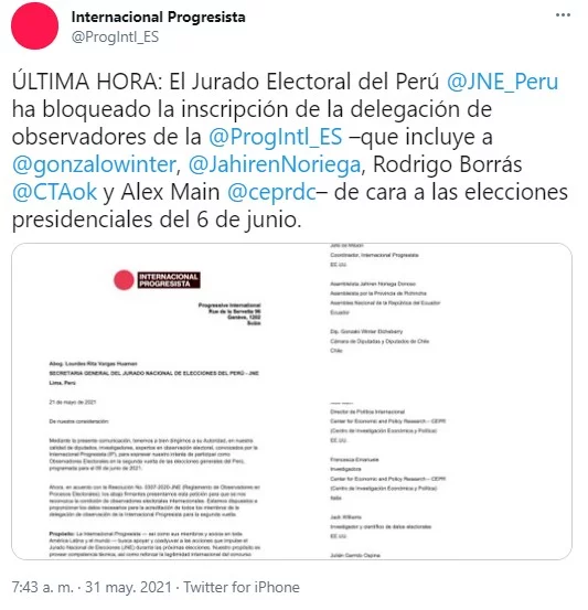 El pasado 21 de mayo de este año, una delegación de diputados, investigadores y especialistas de la organización Internacional Progresista envió una solicitud escrita a Lourdes Vargas Huamán, secretaria general del JNE, pidiendo credenciales de observadores internacionales, como lo permite el Reglamento de Observadores en Procesos Electorales.