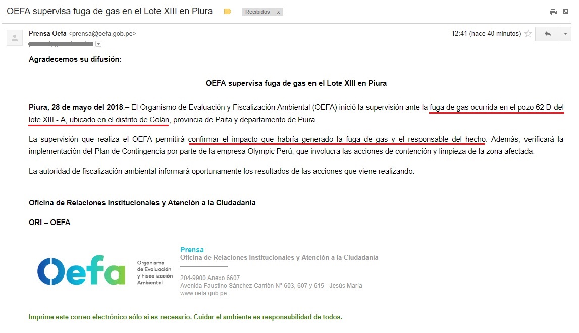 El Organismo de Evaluación y Fiscalización Ambiental (OEFA) señaló que ya inició la supervisión de la fuga de gas registrada en La Bocana de Colán, provincia de Paita, a causa de los trabajos que se realizaban en un pozo de la empresa Olympic.