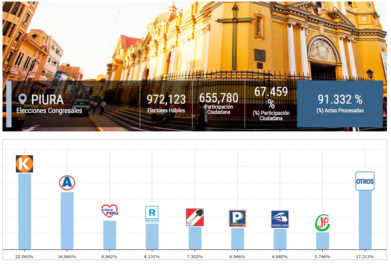 Al 91% de actas Congresales procesadas en Piura, Fuerza Popular logra hacerse de tres escaños de los siete asignados a la región Piura. Alianza para el Progreso asegura dos curules, mientras Somos Perú y Renovación Popular logra un escaño, cada uno.