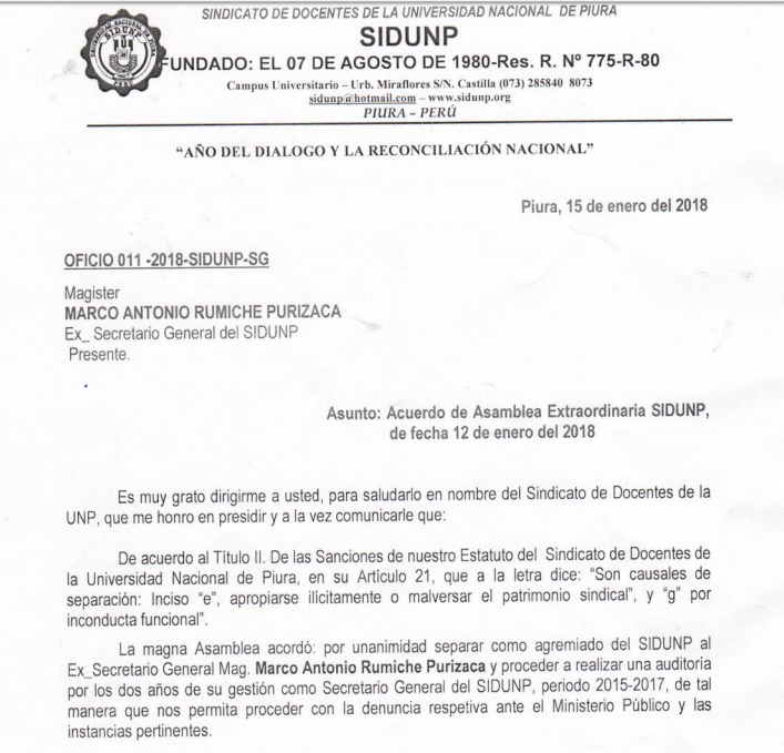 El Sindicato de Docentes de la Universidad Nacional de Piura (SIDUNP) separó del gremio al profesor Marco Rumiche Purizaca, y dispuso realizar una auditoría a su gestión de 2 años como secretario general.