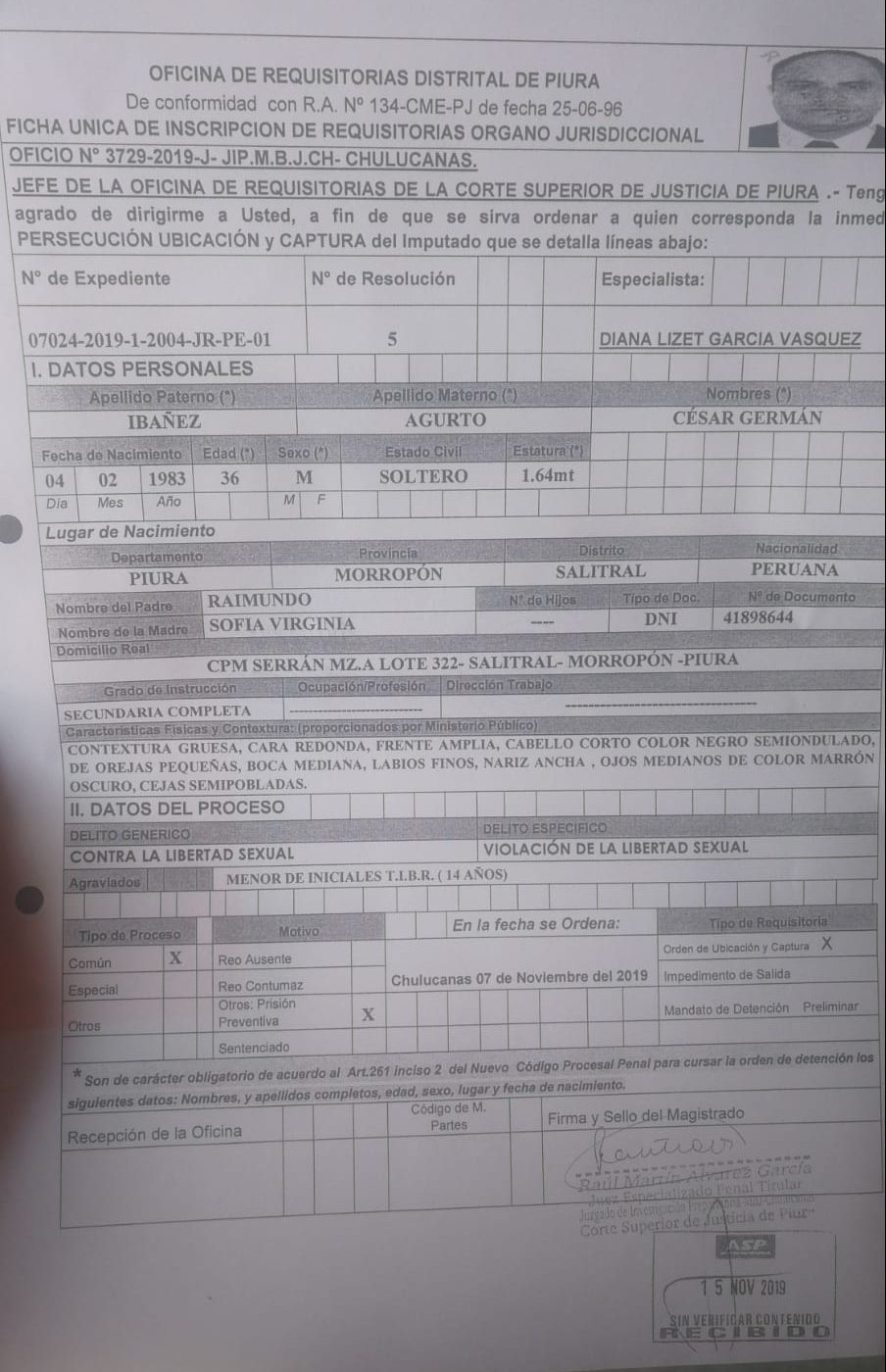 La abogada del CEM de Chulucanas, Fiorella Hidalgo Palacios, quien brinda acompañamiento legal a la víctima y su familia, manifestó que, este cambio se aprobó el 7 de noviembre. Pero, es el 15 de noviembre, que el Juzgado notificó la orden de orden de búsqueda, ubicación y captura de Germán Ibáñez Agurto, ante la oficina de Requisitorias de la Corte Superior de Justicia de Piura y la Policía Judicial.  El docente se encuentra como no habido.