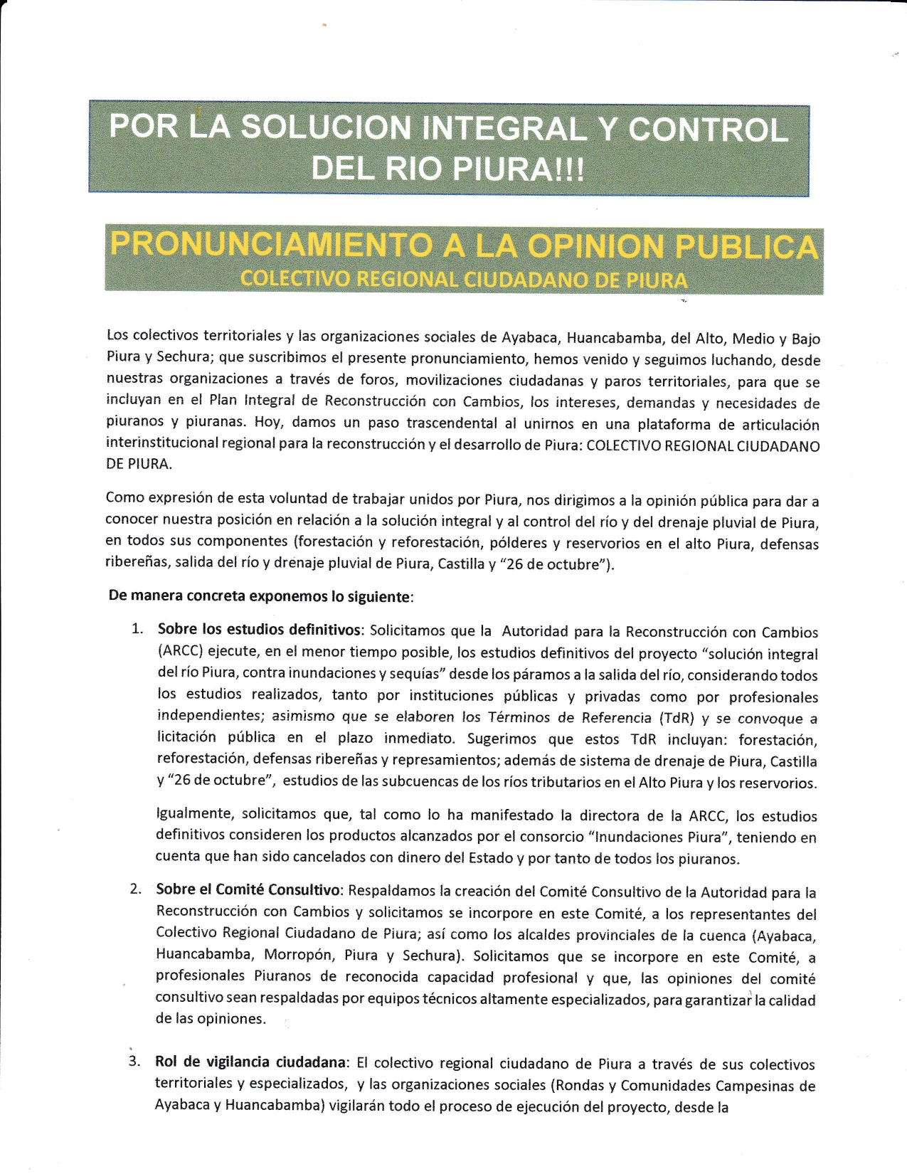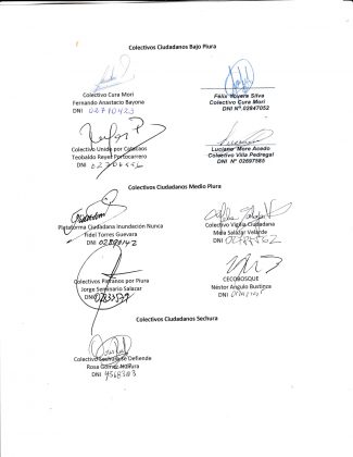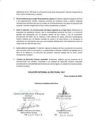 Para ello, el colectivo solicitó que la Autoridad para la Reconstrucción con Cambios (ARCC) considere los estudios realizados por instituciones públicas y por profesionales independientes que tienen conocimiento de la situación de Piura en cuanto al plan del río. Asimismo, pidió que se consideren los productos alcanzados por el consorcio «Inundaciones Piura».