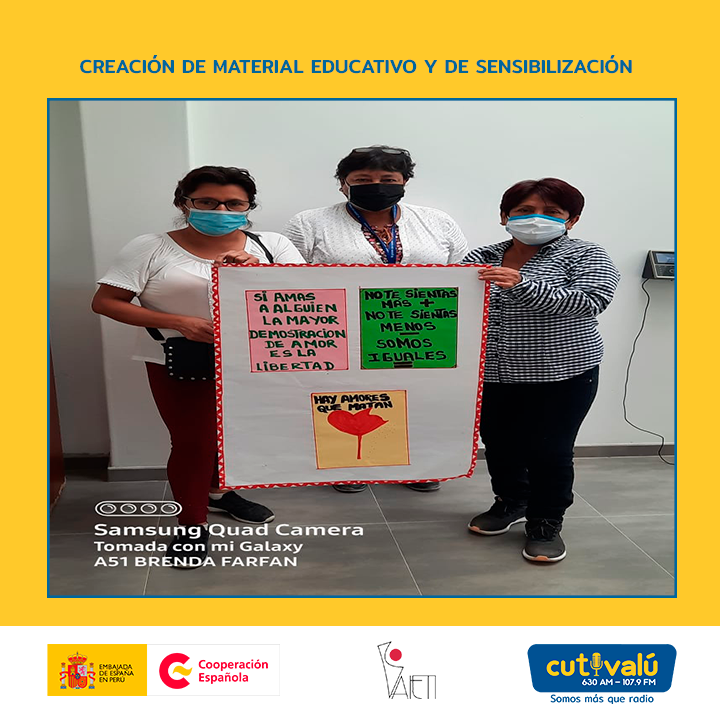 Lideresas y líderes están ejecutando charlas réplicas en sus asentamientos y distrito, a través de las bocinas comunales, grupos de WhatsApp, presenciales con pequeños grupos con material creados a mano, donde informan sobre la Ley 30364, las distintas maneras y formas de la violencia, cómo reconocerla y a dónde acudir en caso de maltrato.