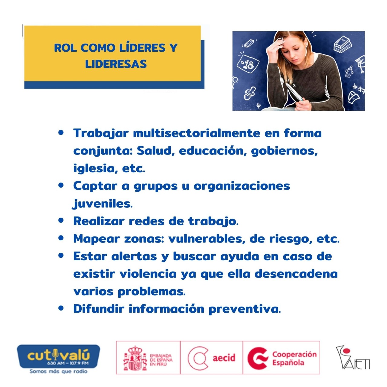 Quienes han fortalecido sus roles y participación en la lucha contra la violencia, a través de capacitaciones y asesorías dos veces por mes, desde febrero a abril del presente año. En temas sobre su Rol como lideresas y líderes frente a la problemática del embarazo adolescente; Brechas de Género, causas y efectos en la comunidad; Síndrome de Indefensión Aprendida temática para mejorar la atención y comprensión de la víctima de violencia.