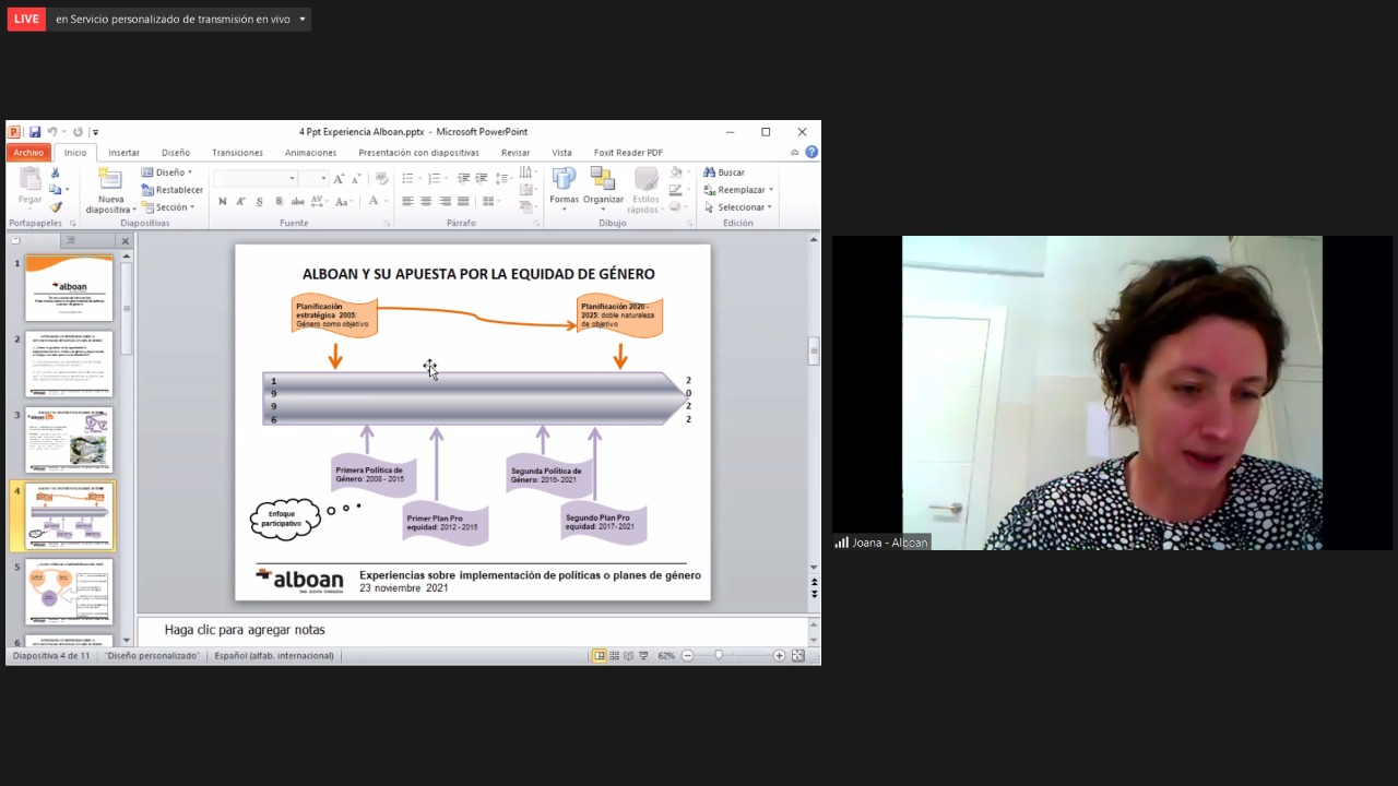 La Lic. Joana Castresana, del Grupo de Género de Alboan, indicó que la organización apuesta por la equidad de género, desde sus inicios. «Alboan es la ONG jesuita que trabaja por la construcción de una ciudadanía global que promueva la justicia socio ambiental y la equidad de género. Alboan se ha preocupado por incluir la equidad de género en su misión y esta se ha ido integrando en distintos procesos institucionales, incluyendo la planificación estratégica», destacó Castresana. En este sentido, resaltó que la equidad de género ha sido incluida como uno de los objetivos del plan al 2025 y tiene doble naturaleza: es una causa y también es una estrategia trasversal a los demás objetivos de la institución.