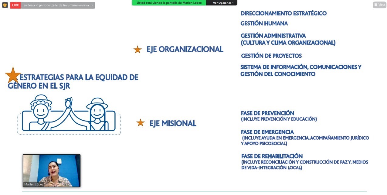 Desde el Servicio Jesuita a Refugiados, la Lic. Marlen López resaltó que la meta de la política sobre enfoque de género es «aportar al logro de la equidad en contextos de migración forzada mediante la transformación de las relaciones entre hombres y muejres y el fortalecimiento de procesos de construcción de paz». Según señaló, este objetivo se logra a través de la implementación de proyectos y programas que presten atención a las necesidades diferenciadas para hombres y mujeres, promoviendo condiciones para la equidad de género y la inclusión social.