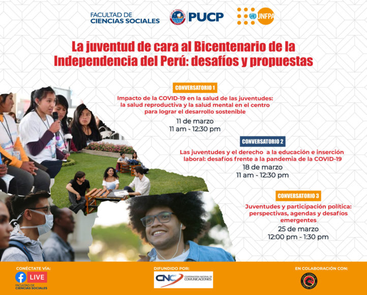 Este evento está conformado por tres mesas de diálogo, cada una a desarrollarse en una fecha distinta: 11, 18 y 25 de marzo. Estas sesiones virtuales reunirán a representantes del Fondo de Población de las Naciones Unidas (UNFPA), la Organización Internacional del Trabajo (OIT), el Programa de las Naciones Unidas para el Desarrollo (PNUD), Norma Correa (docente de Antropología PUCP), Janina León (docente Economía PUCP), Jorge Aragón (docente Ciencia Política y Gobierno PUCP) y estudiantes de esta casa de estudios, quienes evaluarán los retos que enfrenta la juventud en nuestro país de cara al Bicentenario de la Independencia, teniendo en cuenta el impacto de la pandemia de la COVID-19 en su salud y bienestar.